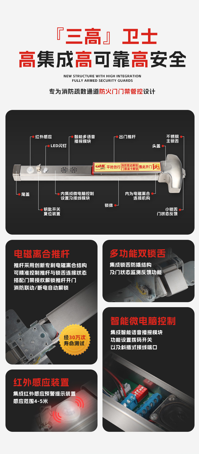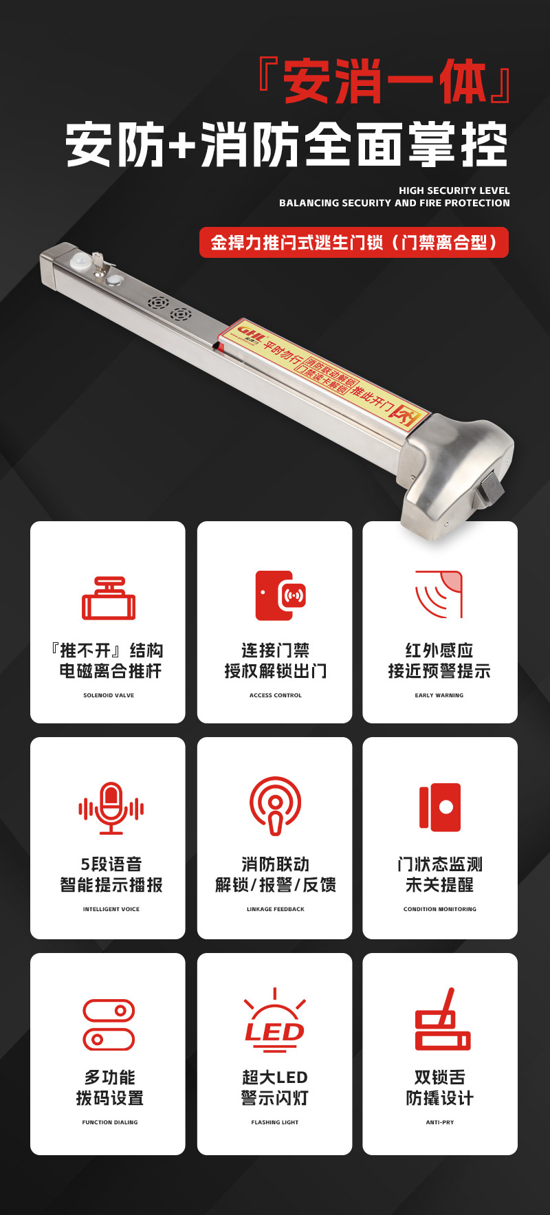 門禁離合型逃生門鎖 紅外感應(yīng)語音報(bào)警推桿鎖 消防聯(lián)動(dòng) 門未關(guān)提醒 金捍力-逃生門鎖系列-金捍安全官網(wǎng)-逃生門鎖-推桿鎖-自動(dòng)平開門機(jī)-電動(dòng)閉門器-電磁門吸-防火門控制器-“安消一體”智能門控專業(yè)廠家