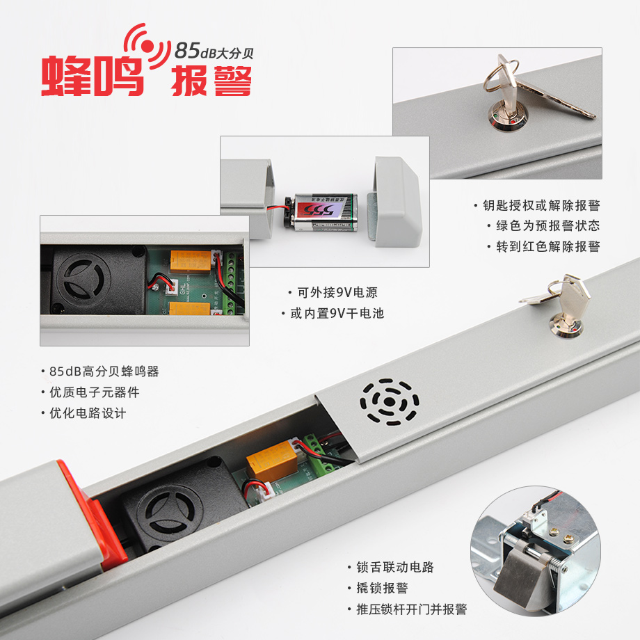 金捍力報(bào)警逃生門鎖鎖舌采用聯(lián)動(dòng)電路設(shè)計(jì),具有防撬報(bào)警功能,正常情況推壓鎖桿開門并報(bào)警,可控制非法人員的出入。通過隨鎖配送的鑰匙實(shí)現(xiàn)報(bào)警功能的授權(quán)開啟和解除。