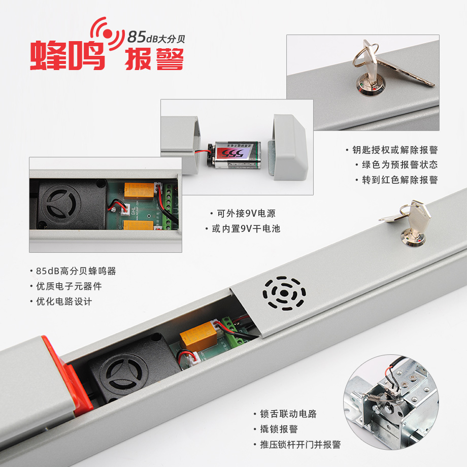 產(chǎn)品介紹:1、具有防撬報警功能, 非法人員從門外不能把門打開, 保證區(qū)域的安全; 2、內(nèi)置高分貝蜂鳴警報器, 可選擇持續(xù)報警或不報警模式; 3、可外接閃燈或聲光報警器; 4、報警音量:約85d8; 5、報警工作時間:連續(xù)鳴叫3h以上。