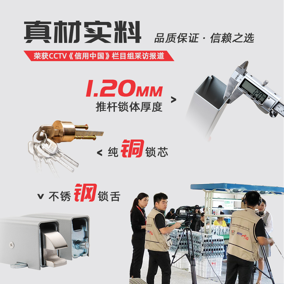 金捍力逃生門鎖真材實料,品質(zhì)有保障,故而獲得CCTV《信用中國》欄目組的采訪報道。金捍力逃生門鎖噴塑鎖體厚度達1.20mm以上,比一般逃生門鎖都要厚實,耐用。鎖芯采用純銅材料,鎖舌精選不銹鋼材質(zhì)鑄造。
