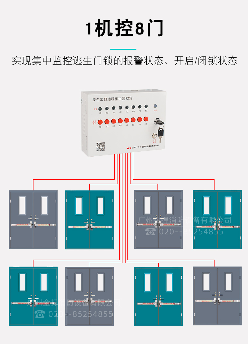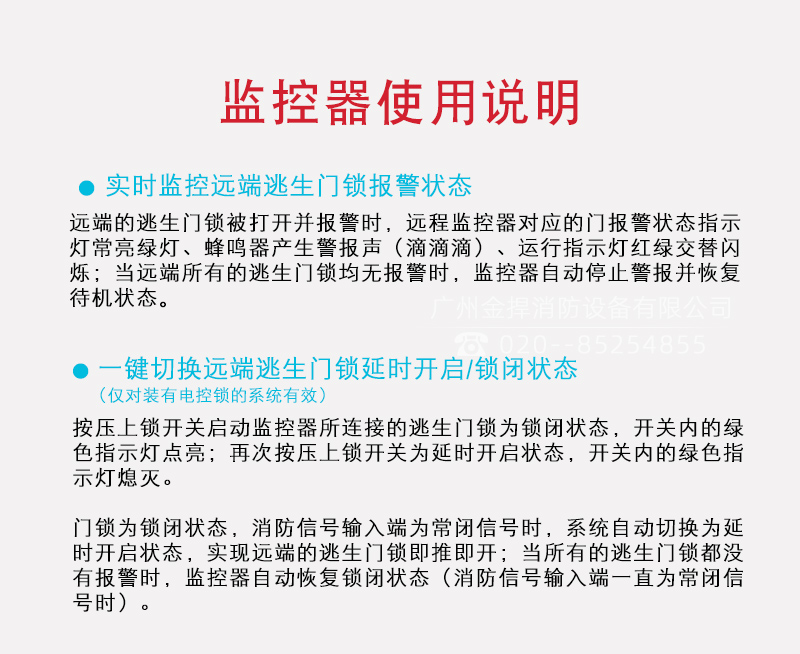 產(chǎn)品介紹:1、實時監(jiān)控遠端逃生門鎖報警狀態(tài); 2、遠端的逃生門鎖被打開并報警時,遠程監(jiān)控器對應(yīng)的門報警狀態(tài)指示燈常亮綠燈、蜂鳴器產(chǎn)生警報聲(滴滴滴)、 運行指示燈紅綠交替閃爍,當遠端所有的逃生門鎖均無報警時,監(jiān)控器自動停止警報并恢復(fù)待機狀態(tài)。 一鍵切換遠端逃生門鎖延時開啟/鎖閉狀態(tài)(僅對裝有電控鎖的系統(tǒng)有效): 3、按壓上鎖開關(guān)啟動遠程監(jiān)控器所連接的逃生門鎖為鎖閉狀態(tài),開關(guān)內(nèi)的綠色指示燈點亮,再次按壓上鎖開關(guān)為延時開啟狀態(tài),開關(guān)內(nèi)的綠色指示燈熄滅。 4、門鎖為鎖閉狀態(tài),消防信號輸入端為常閉信號時,系統(tǒng)自動切