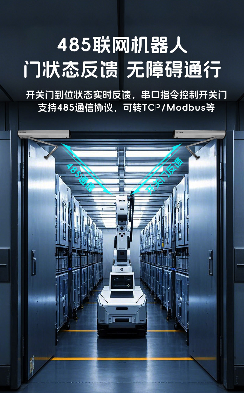 ● 支持485 通訊協(xié)議,可接入門禁、監(jiān)控、機器人等平臺聯(lián)網(wǎng)指令控制、開關(guān)門到位狀態(tài)信號反饋
