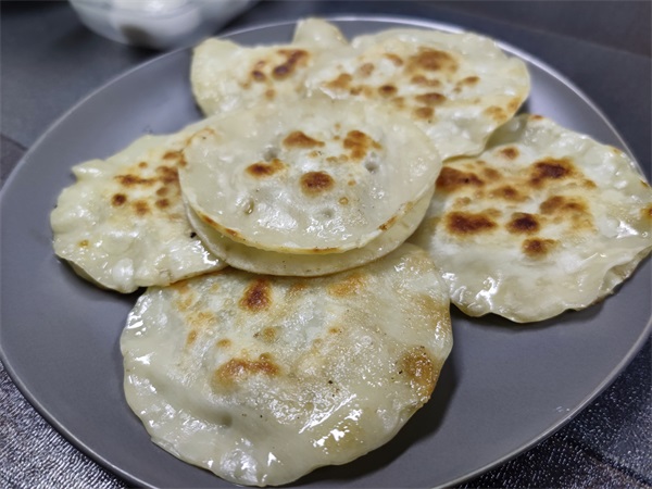 剩下的餃子皮在大廚掌勺下,搖身一變成為煎餅,一個字:真香!